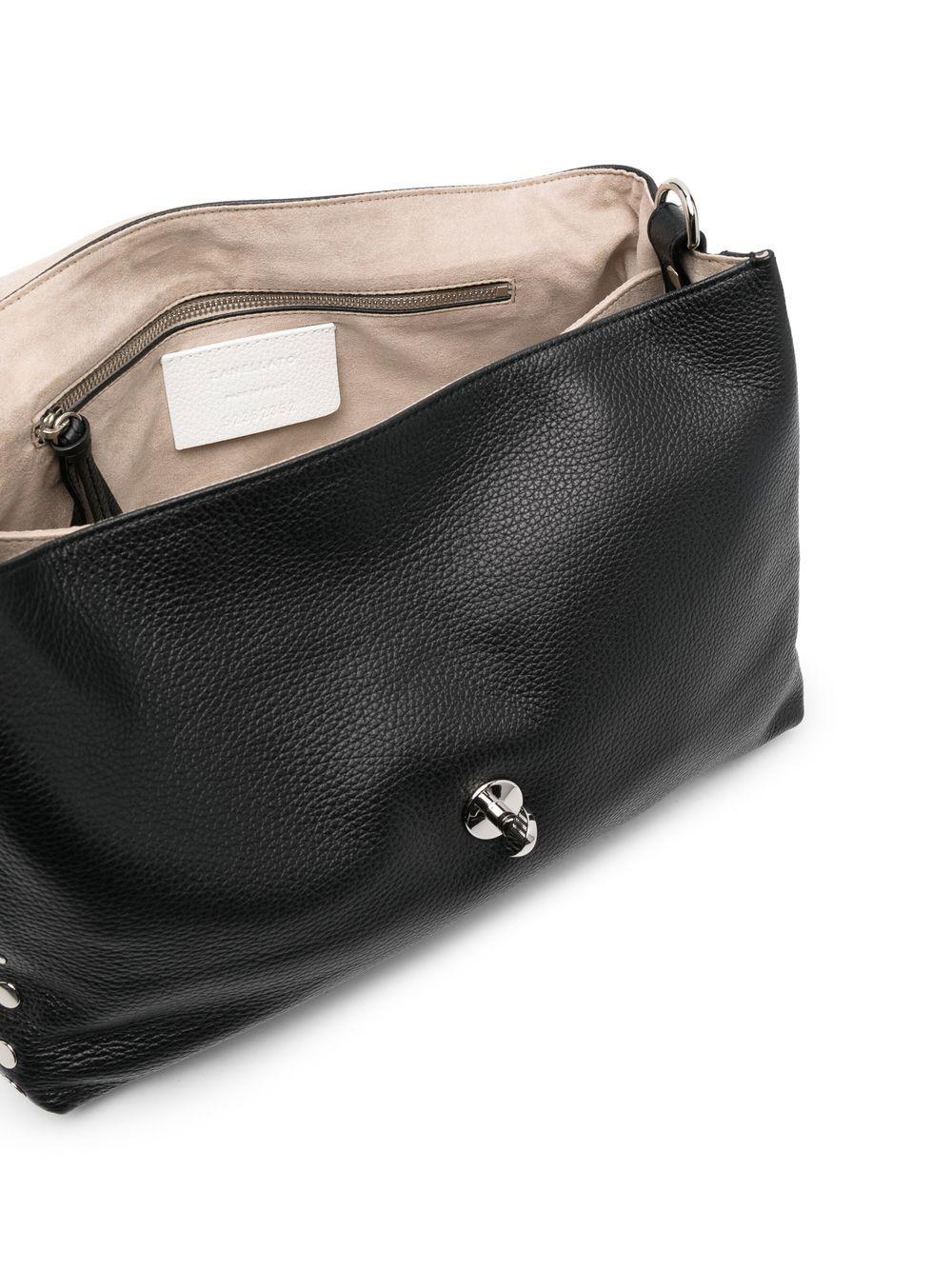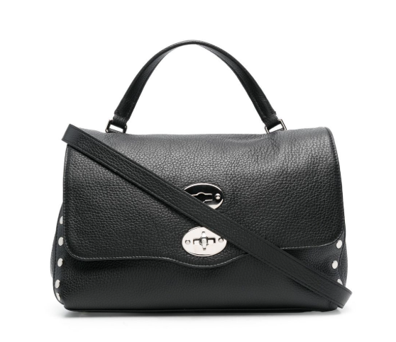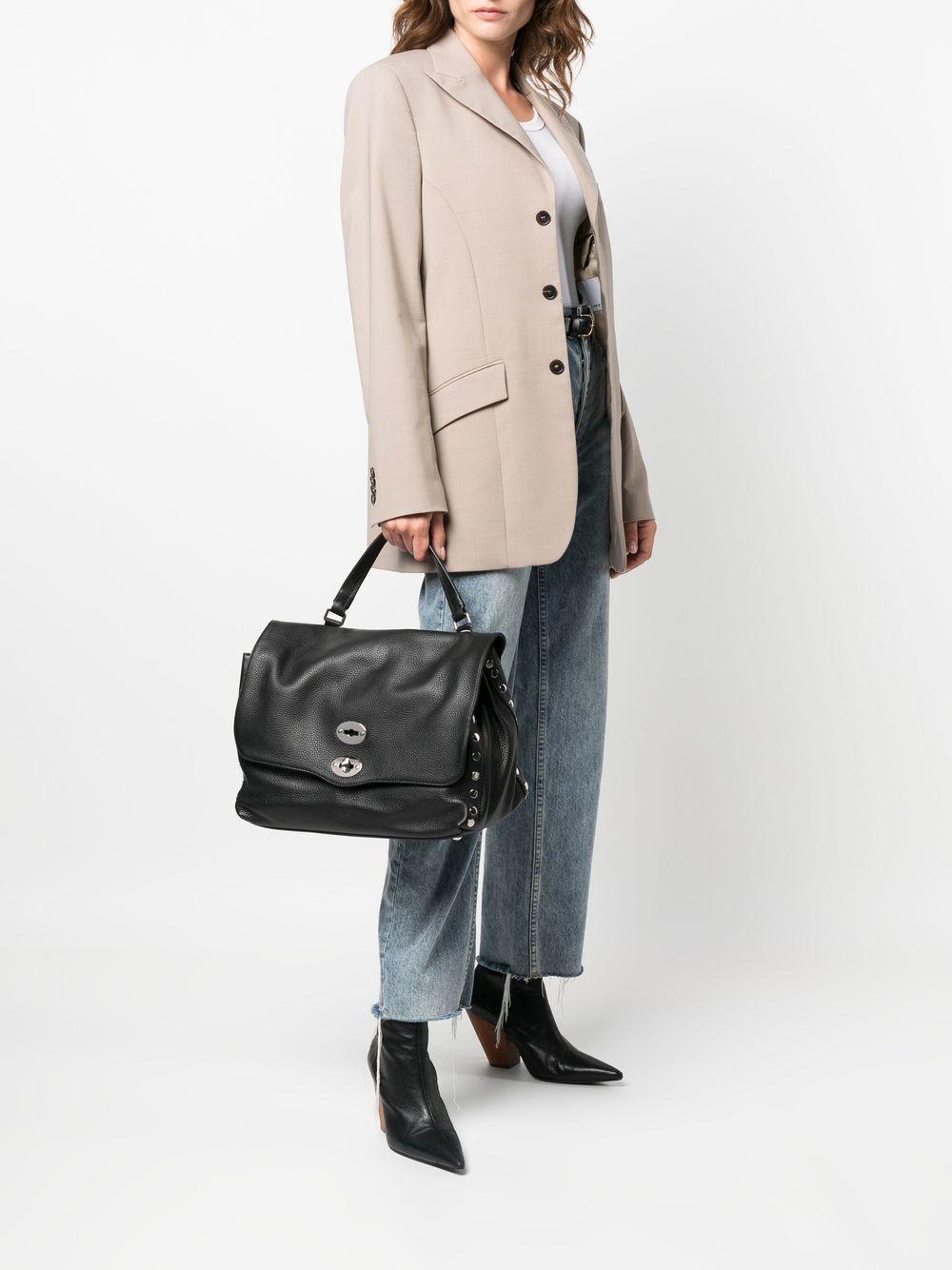 jet black calf leather pebbled texture silver-tone stud detailing foldover top twist-lock fastening single flat top handle detachable shoulder strap adjustable grosgrain shoulder strap partitioned compartment internal logo patch internal zip-fastening pocket internal slip pocket twill lining silver-tone hardware metal feet This piece comes complete with a protective dust bag.