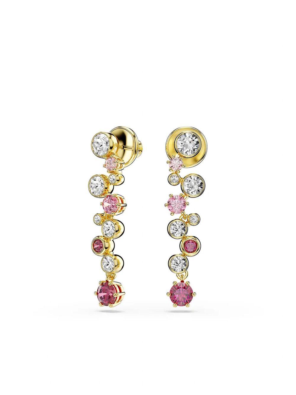 gold pink and red crystals round crystal embellishments varying crystal sizes adjustable sliding clasp delicate chain prong and bezel setting post-back closure earrings set of three