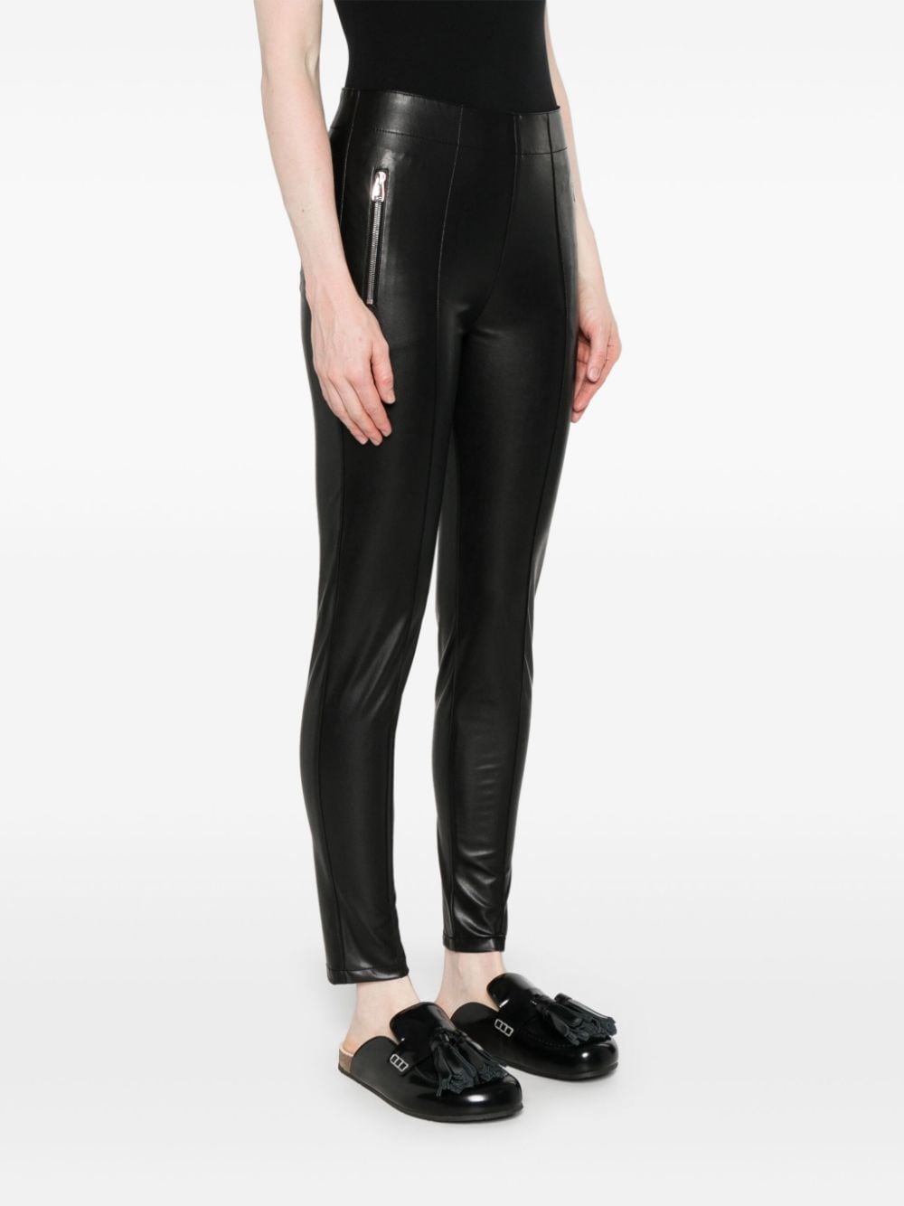 similicuir noir grain lisse coutures en relief ceinture élastiquée poches zippées sur le devant jambe fuselée coupe skinny